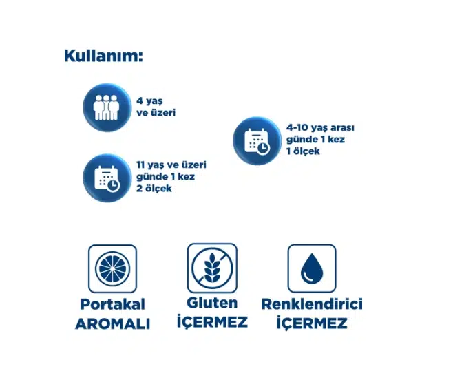 Kullanım Önerisi 4-10 yaş arası çocuklar için günde 1 ölçek (5 mL), 11 yaş ve üstü yetişkinler için günde 2 ölçek (10 mL) yemeklerle birlikte alınması önerilir.
