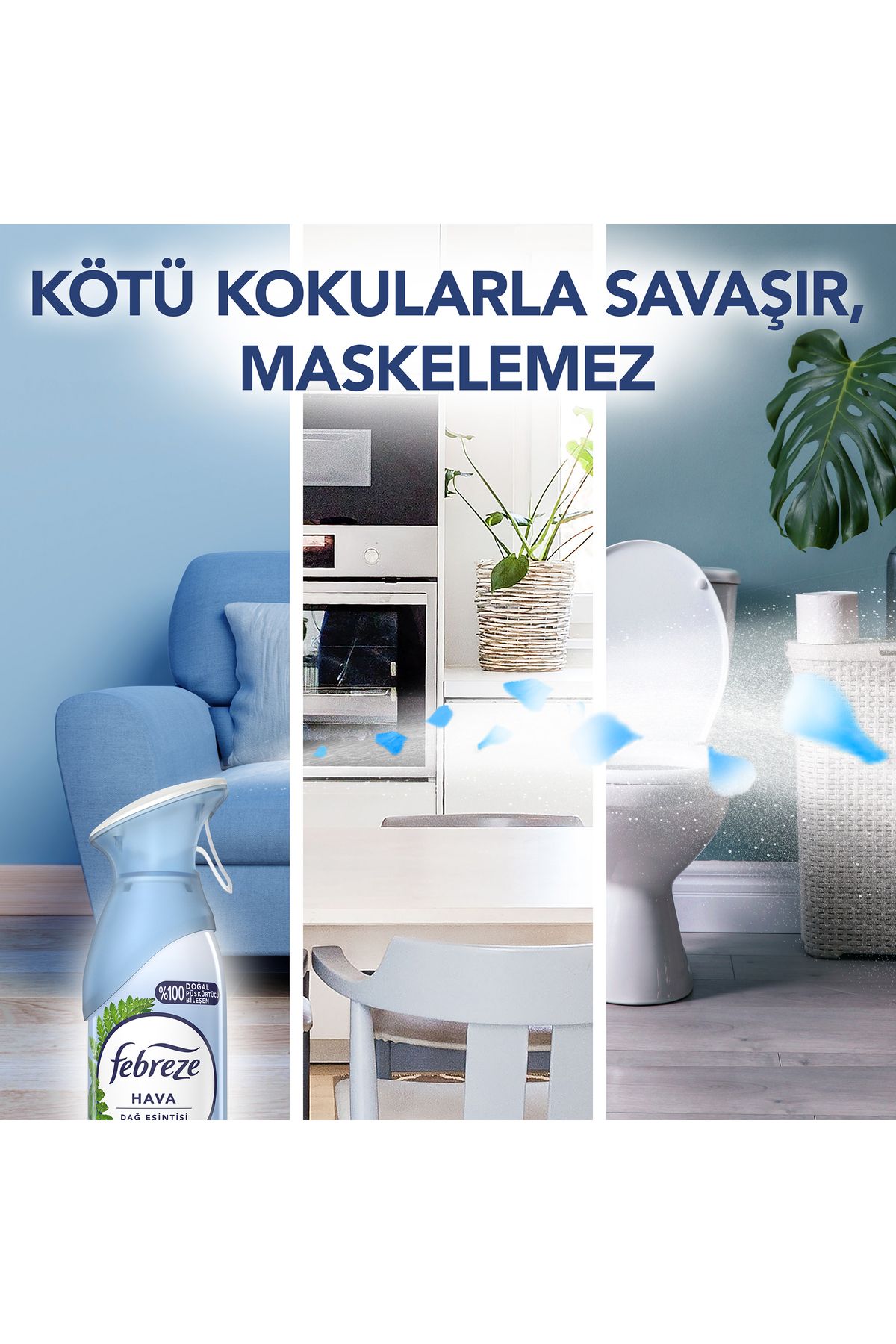Febreze’in eşsiz teknolojisi sayesinde istenmeyen kokulara karşı güçlü bir etki sağlar. “Temizlik kokusu” gibi yapay değil, doğal ve hafif dağ havası hissi verir. Mutfak, banyo, yatak odası veya salon gibi tüm alanlarda güvenle kullanılabilir.