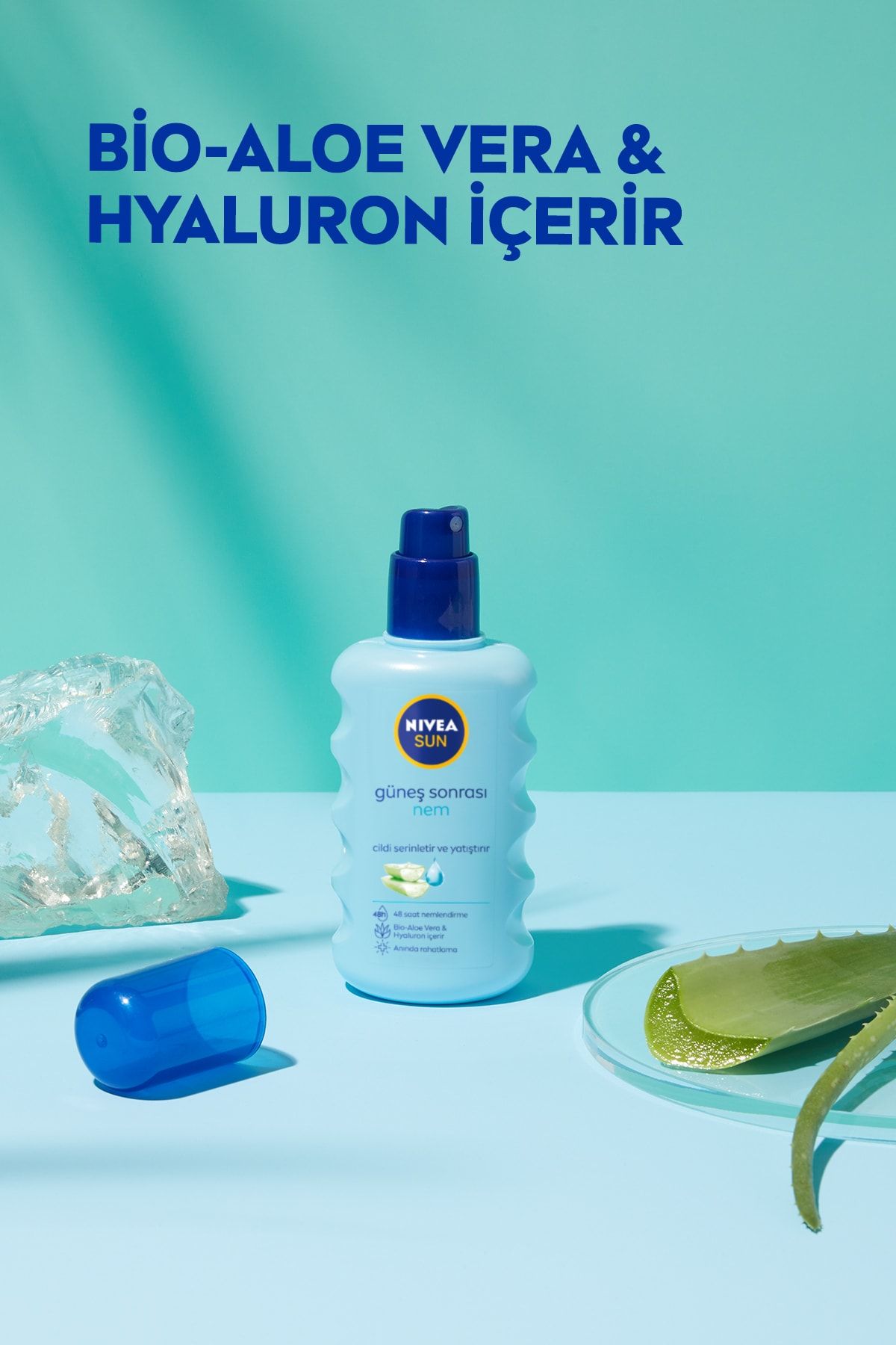 Nivea Sun Güneş Sonrası Nemlendirici Sprey, güneşe maruz kalan cildi anında rahatlatmak ve 48 saat boyunca nemlendirmek için özel olarak geliştirilmiştir. İçeriğindeki hyaluron ve aloe vera ile cilde yoğun nem sağlar, ferahlık hissi verir ve cildin doğal yenilenme sürecine destek olur.