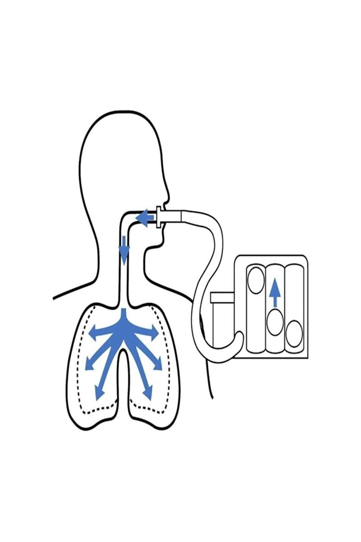 Solunum Egzersiz Cihazı (Triflo) Plasti-Med 180101Solunum egzersiz cihazları solunum yollarındaki kasları güçlendirmek, daha rahat nefes alıp vermeyi sağlamak, akciğer kapasitesini arttırmak amacıyla kullanılan ürünlerdir. Marka ve modele göre farklılıklar göstermesine rağmen genel olarak cihazların çalışma prensibi benzerdir. Hasta nefes alır, ağızlık yardımıyla nefesini cihaza doğru üfler. Cihaz içinde bulunan toplar, bilyeler ve benzeri maddelerin oluşturduğu direnç sayesinde kişi solunum egzersizi yapar.Plasti-Med 180101 içerisinde mavi, beyaz ve kırmızı olmak üzere 3 adet top bulunan bir solunum egzersiz cihazıdır. Türkiye menşeilidir. Ağızlığın bulunduğu hortum ve topların bulunduğu plastik kısım olmak üzere iki parçadan oluşmaktadır. Hortum topların bulunduğu kısma takılır, nefes ağızlık yardımıyla cihaza doğru üflenir. Plastik kısımda bulunan renkli toplar aynı zamanda nefes seviyesini belirtir. Düşük seviyeli egzersizlerde 600 mililitreye karşılık gelen mavi top nefesle yukarı doğru kaldırılır. Yüksek seviyeli egzersizlerde mavi topla beraber 900 mililitreye karşılık gelen beyaz top da yukarı kaldırılır. Maksimum seviyedeki nefes egzersizleri için ise mavi ve beyaz topla birlikte 1200 mililitreye karşılık gelen kırmızı top yukarı kaldırılır. Tek bir hasta için kullanılmalıdır. Ağırlığı 149 gram, boyu 14,3 santimetredir.